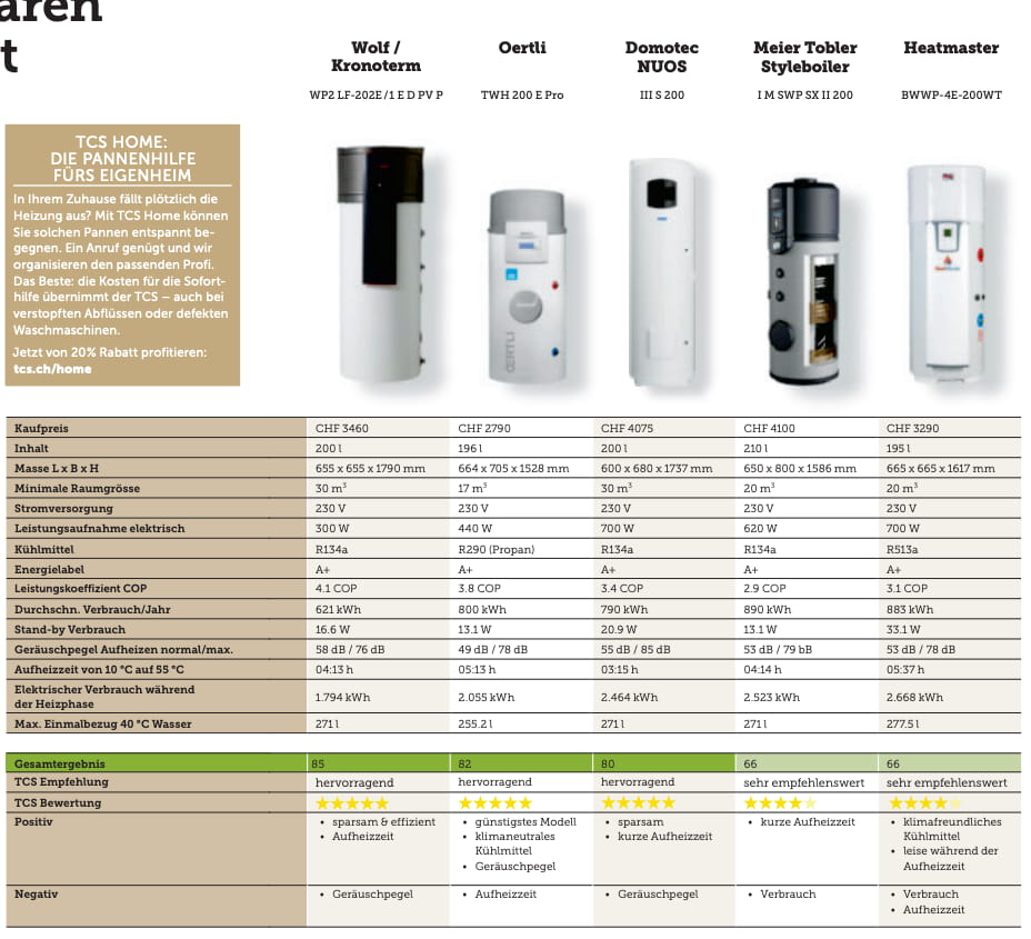 Quelle: TCS Testsieger Bericht Wärmepumpenboiler